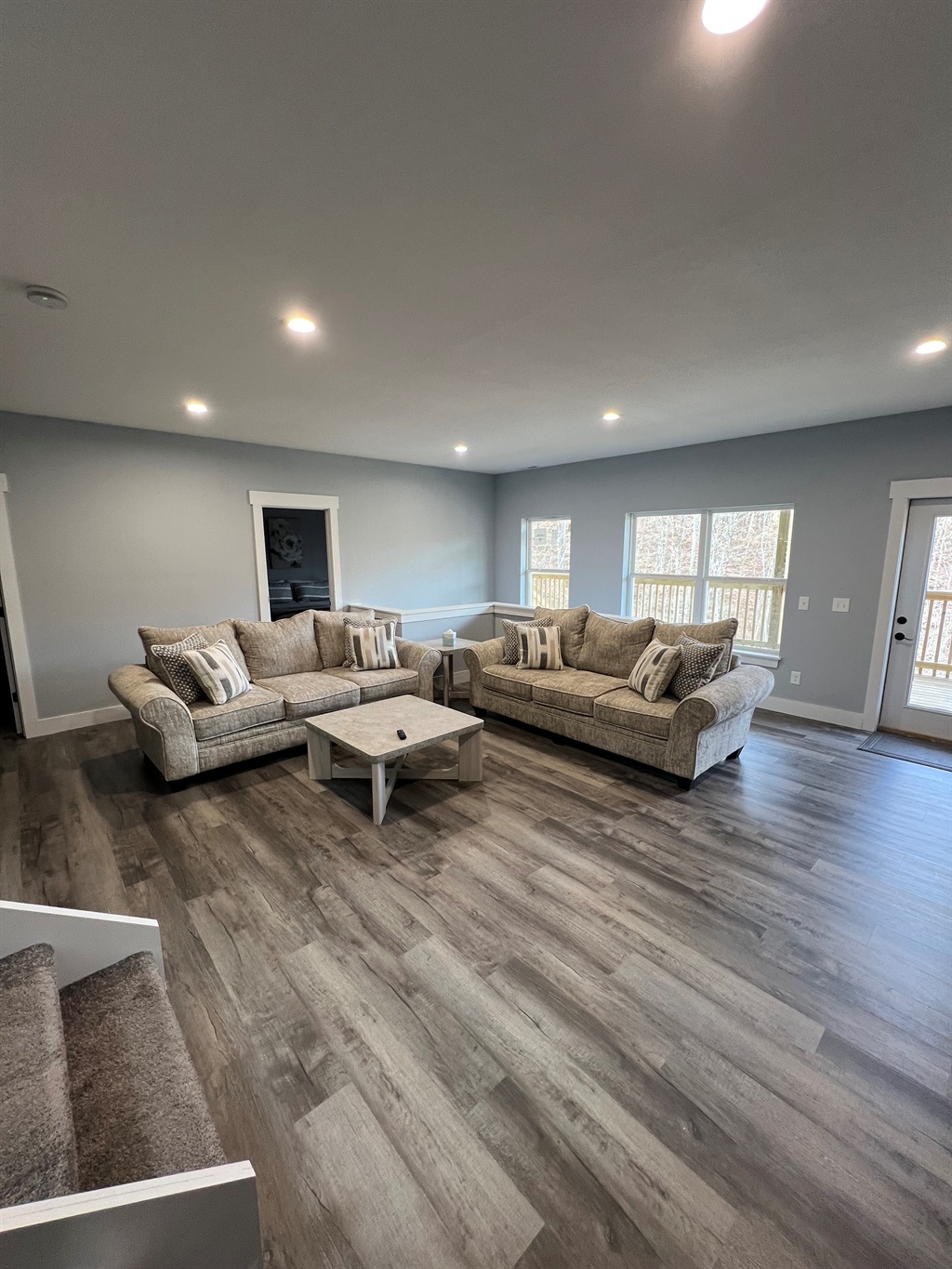 Rec room with foosball & basketball shot opens to a flat area featuring hot tub , fire pit, corn hole, and direct lake access. Private dock sits in a serene, lagoon-like cove with zero boat traffic.